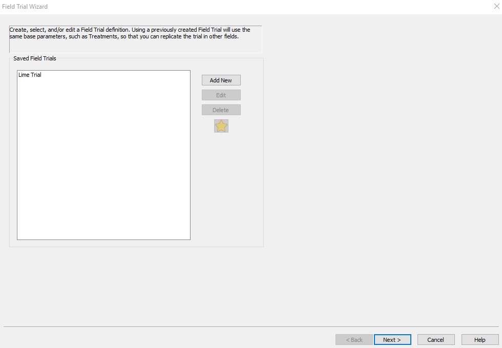 In the Field Trial Wizard window all of your existing Field Trials will be displayed in the Saved field Trials window. To build a new one select Add New.
