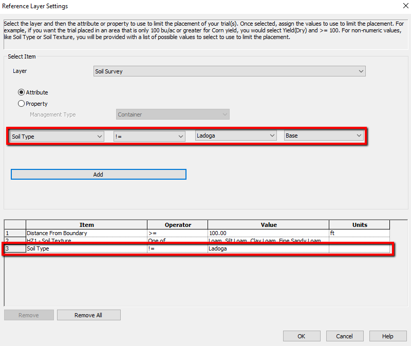 In the example below a filter was added that will prevent the trial from being placed in Ladoga Soil.