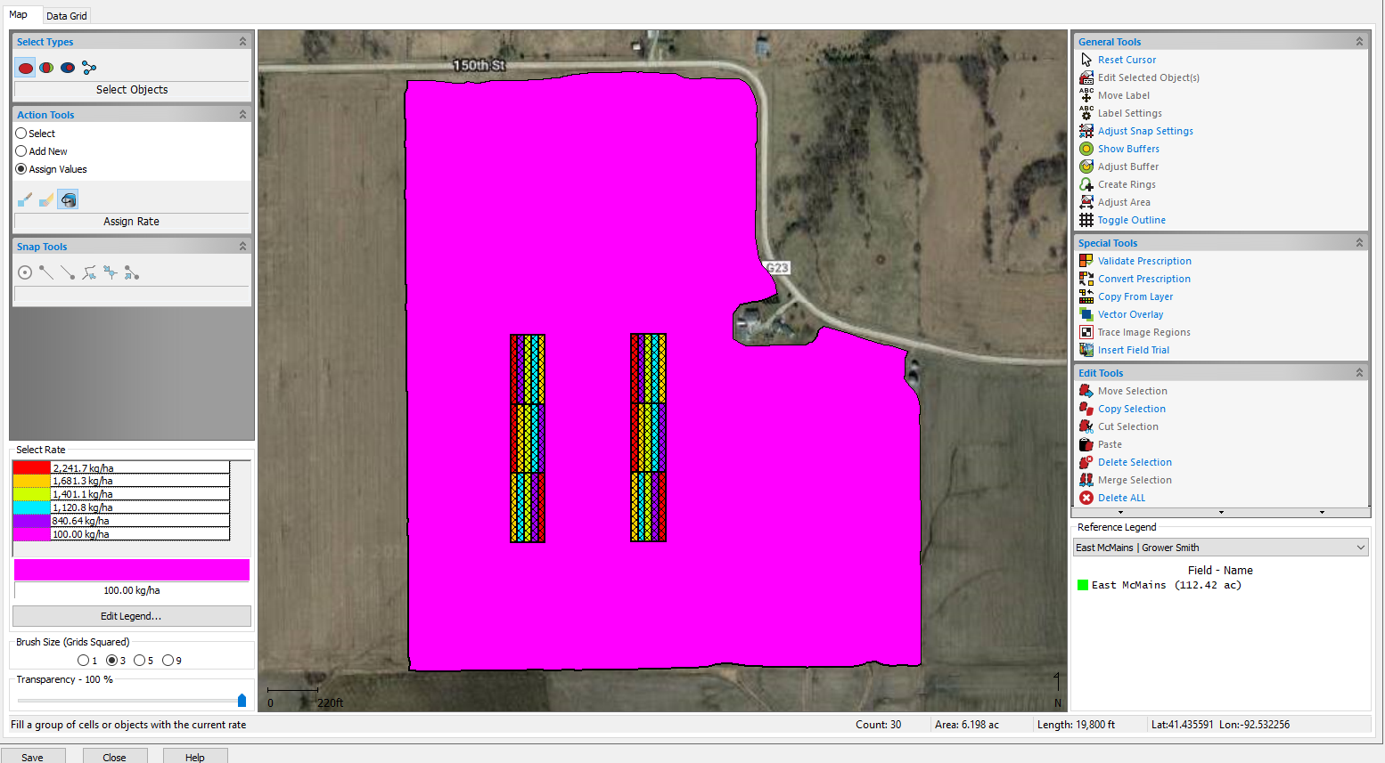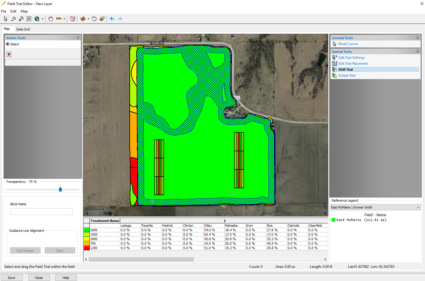Click Finish and the Field Trial Editor window will now open. The grid at the bottom will display the treatment name and soil survey properties.
