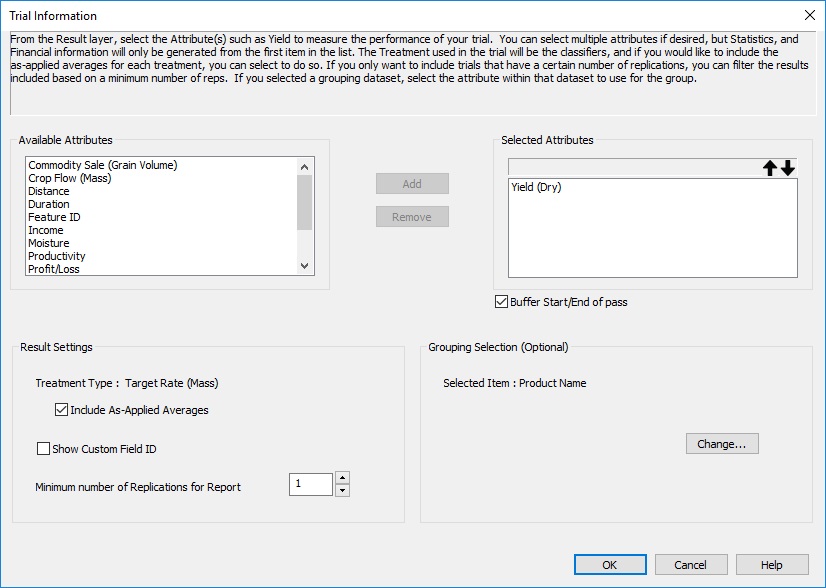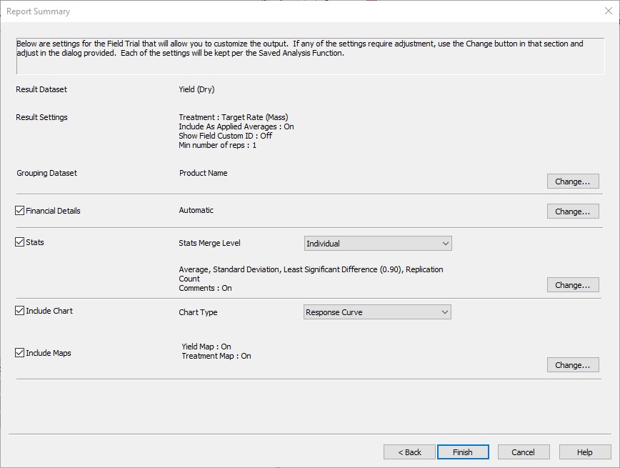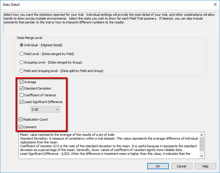 - Stats Details: Here you can choose between four merge levels to show your statistics. Individual will give you the highest level of detail and include all maps and charts, Field Level will merge the data by field and won’t show individual treatments or maps, and Grouping Level will show how your treatments did by the grouping attribute you selected earlier in Trial Information. By selecting change you can also select which stats to view as shown below. They will show in the report as shown on step 5B.