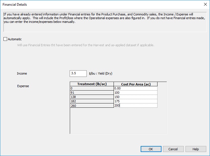 - Financial Details: If this is checked your report will show the economic value of your trials based off your as-applied data. If you check Automatic the analysis will use the values found in Financial Tracking. If you uncheck Automatic you’ll need to manually fill out your Income and Expense for the trials as shown below.