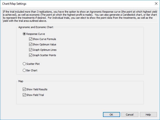 - Chart/Map Settings: Here you can select between three unique charts, and whether to show yield results and your field trial on the map.