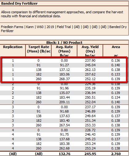 - The block summary will show each block by the trial information selected from 4A. If you selected Individual for your merge level it will show each individual replication, the amount of product applied (target and actual), as well as how that area yielded.
