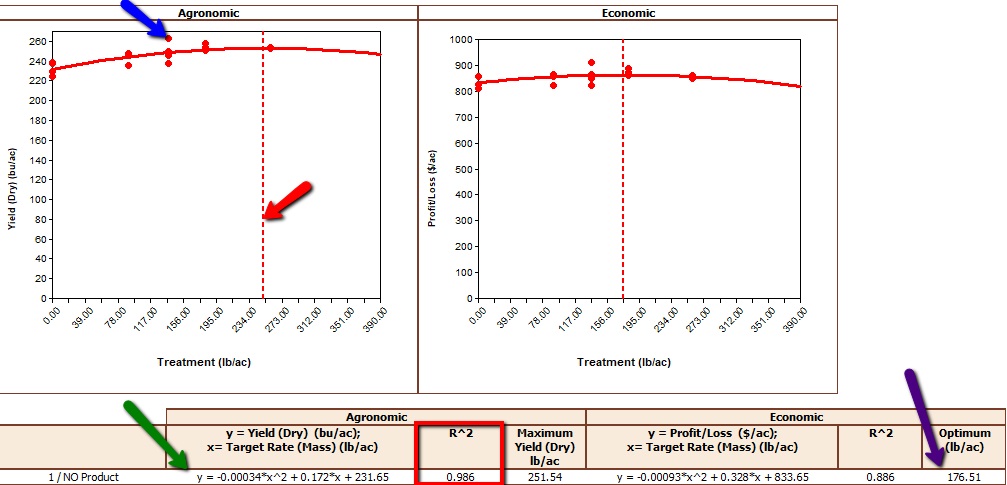 - Response Curve: This option is only available if your trial contains at least 4 unique rates. You can also choose to show the curve formula (green arrow), optimum value (purple arrow), optimum lines (red arrow), and scatter points (blue arrow) shown in outlined in 5C. The red box is a confidence interval; the close the number is to 1 to more reliable the number is.